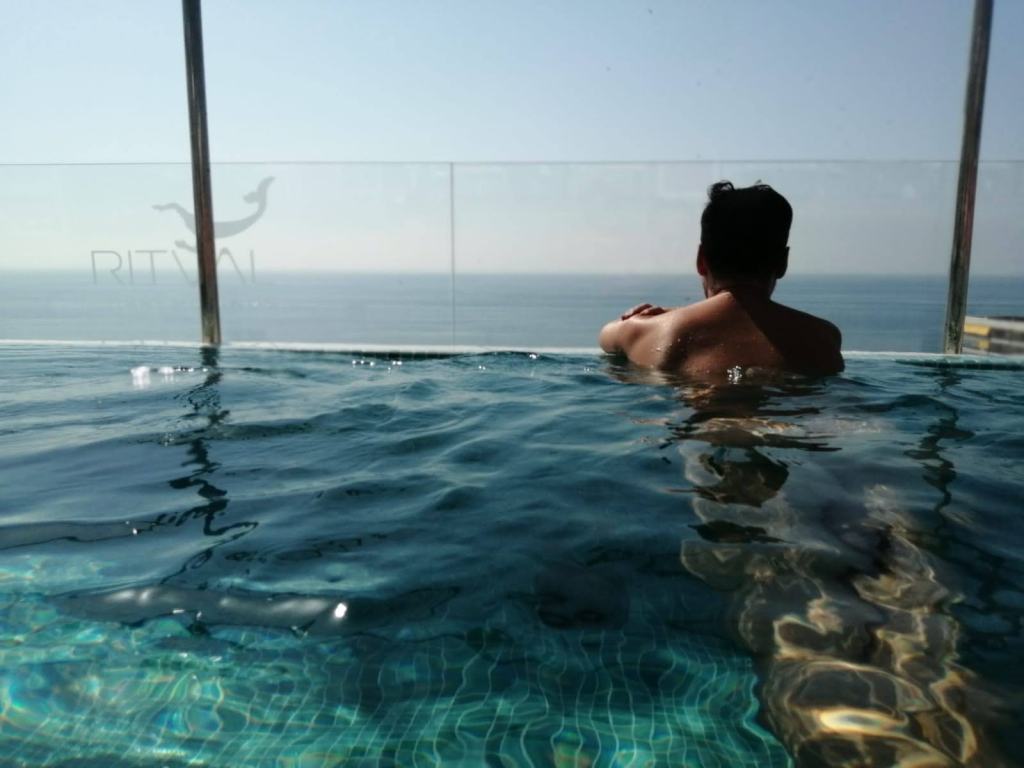 El hotel cuenta con dos piscinas: una más grande bajo y otra en la azotea en la zona nudista. En ambas hay un servicio de bar para pedir bebidas. Como fuimos con todo el tema del Covid ambas piscinas tenían aforo y, especialmente la de arriba, se llenaba en seguida ya que es más pequeño el espacio y la piscina.