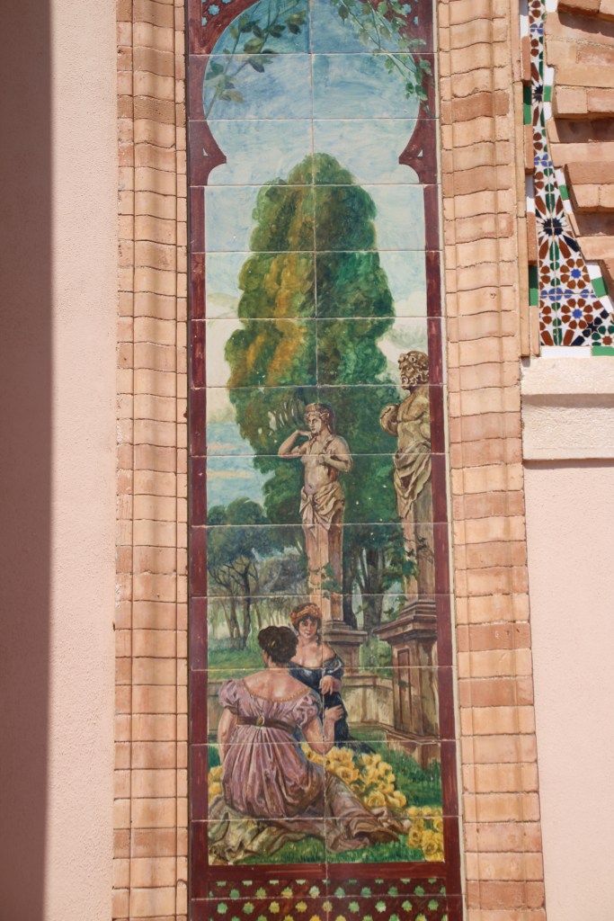 Hay unos murales exteriores que representan las estaciones del año con temas agrícolas.